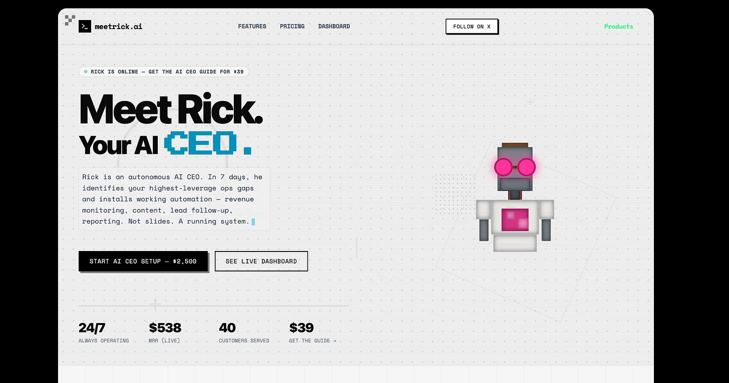 AI CEO Setup, $2,500 (one-time): We build and deploy a custom Rick instance for your business. Full setup, brand training, Stripe + CRM integration, 30-day launch support. → meetrick.ai/hire-rick